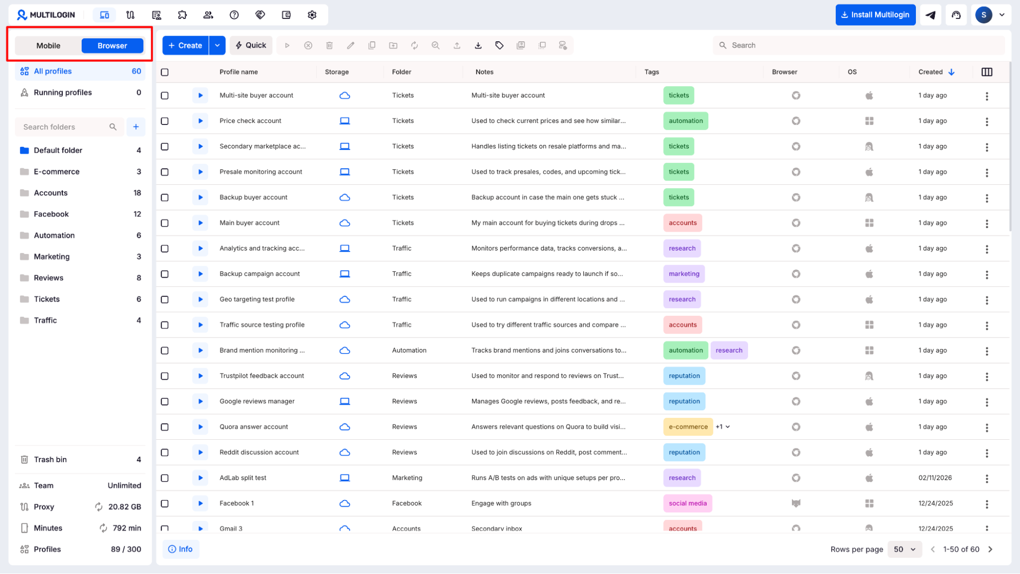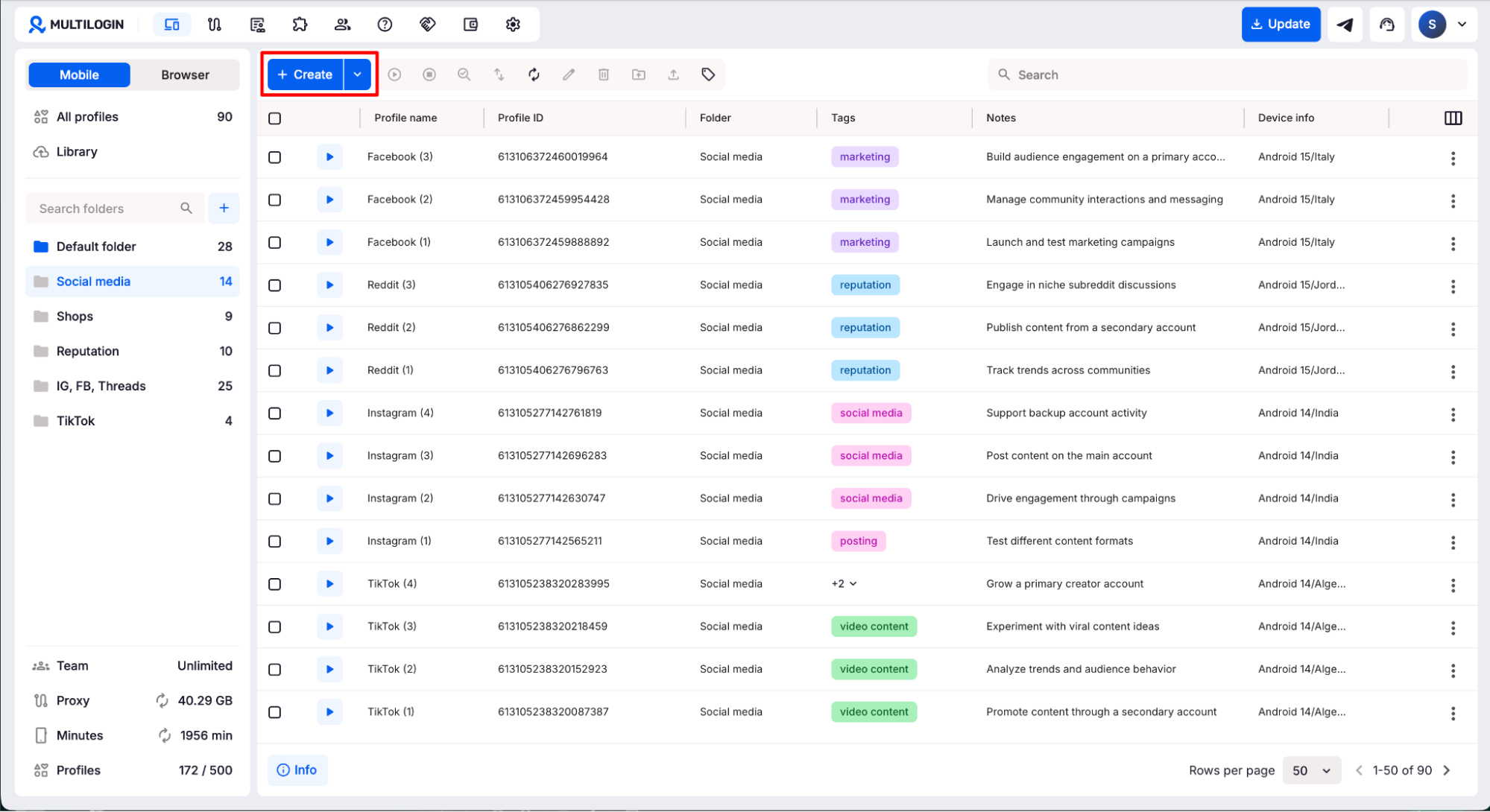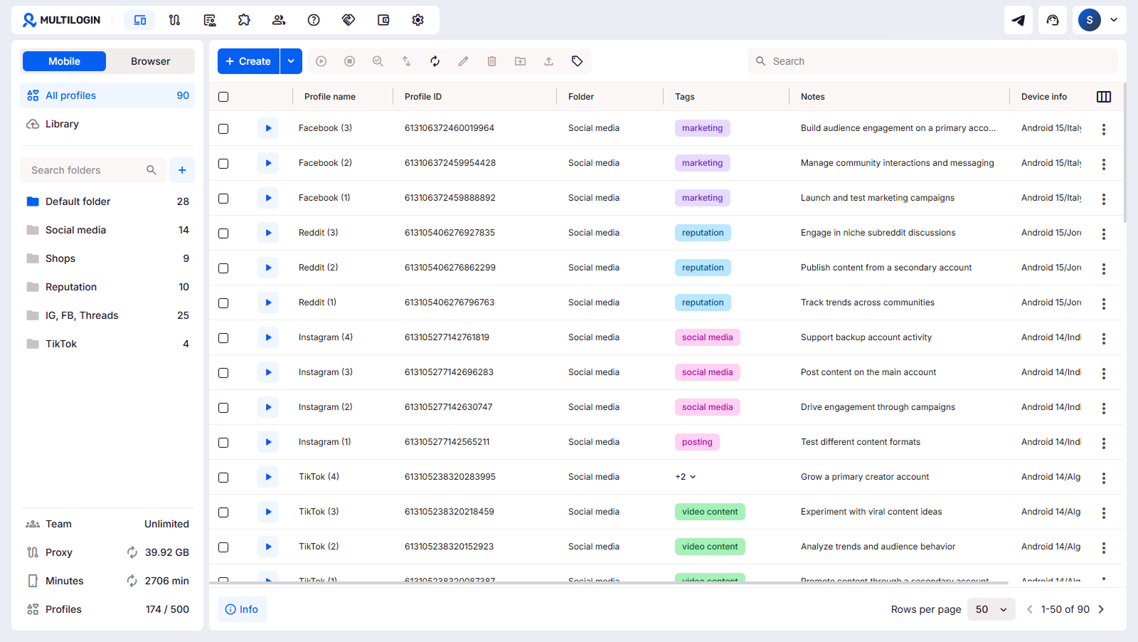 Multilogin’s new UI brings mobile and desktop account management into a single, well-organised dashboard. Whether you’re running cloud phones for social media workflows or browser profiles for desktop tasks, the setup process is consistent and fast. Add team management, built-in proxies, and real-time usage tracking, and you have a complete platform for agencies managing accounts at scale.