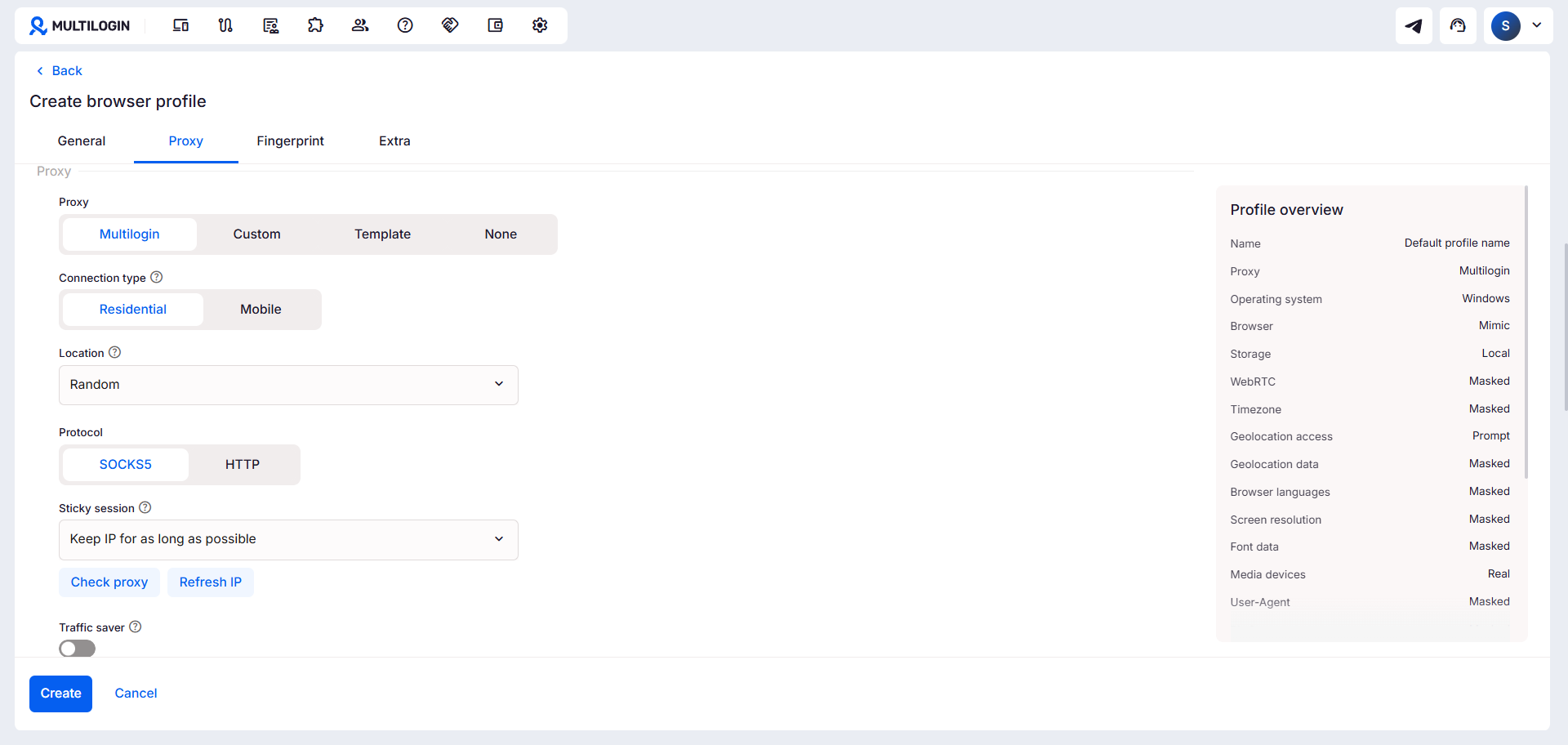 Set up your fingerprinting parameters and connect a proxy. Multilogin’s antidetect browser handles the fingerprint management automatically, so each profile looks like a unique, real user to websites.