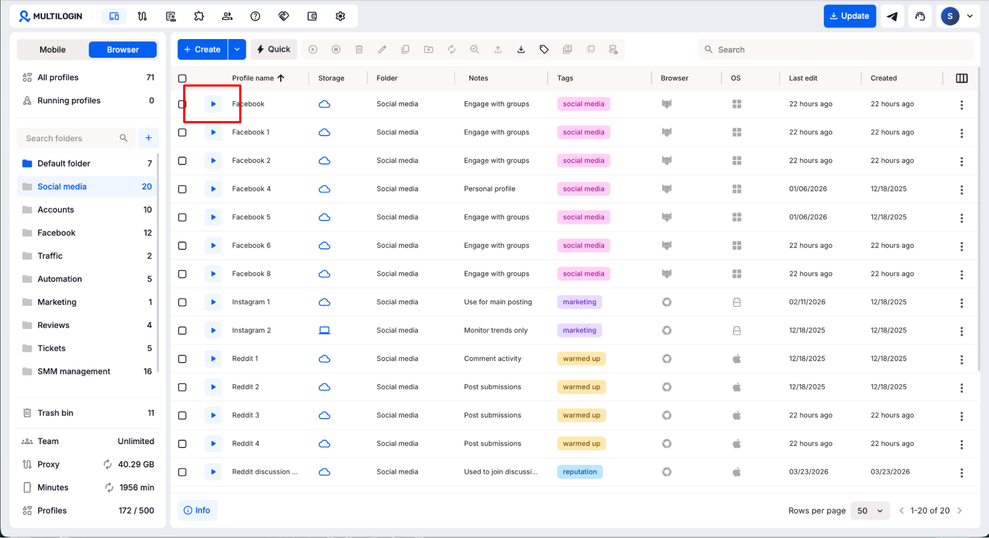 Add tags and notes to keep your profiles structured. You can also assign the profile to a specific folder — useful when managing accounts by client, region, or content type.