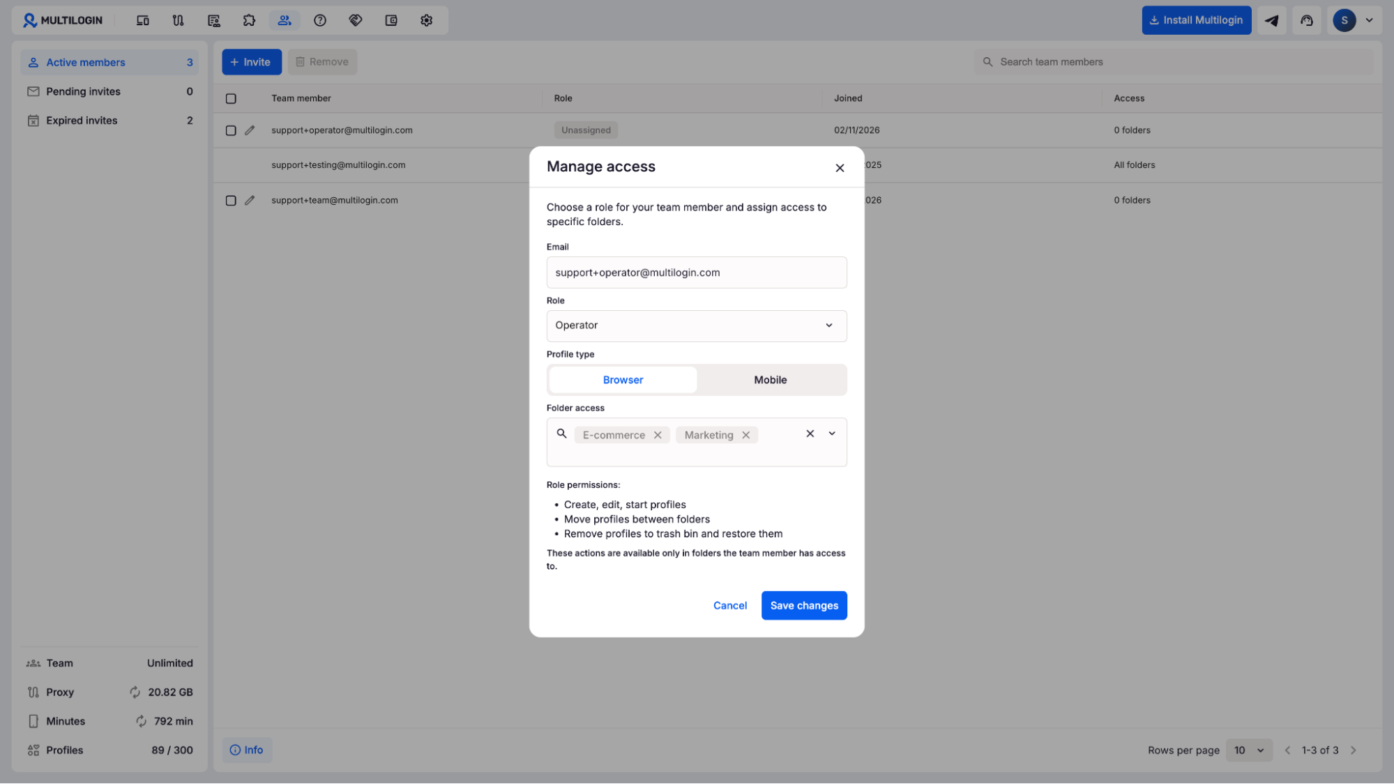 Click the team member settings to invite collaborators. Multilogin supports three roles, so you can control exactly what each person can access. Combine this with folder-based access management to make sure editors, managers, and clients only see what’s relevant to them.