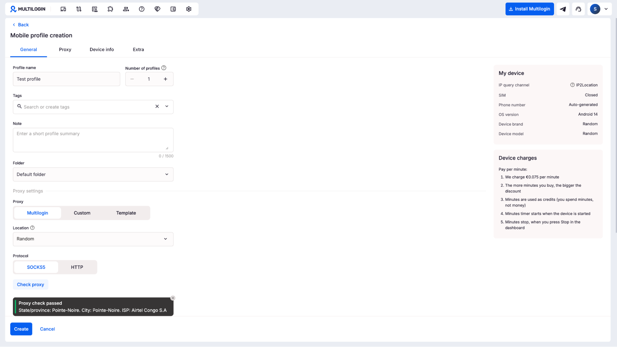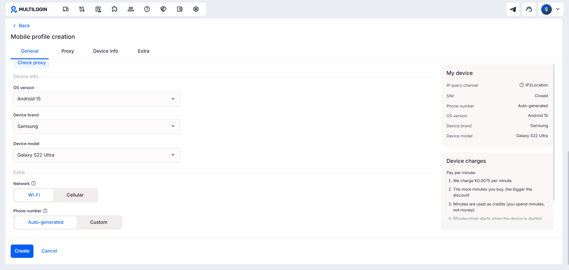 From the main dashboard, make sure you’re in the cloud phone view. Click the Create button to start setting up a new profile.
