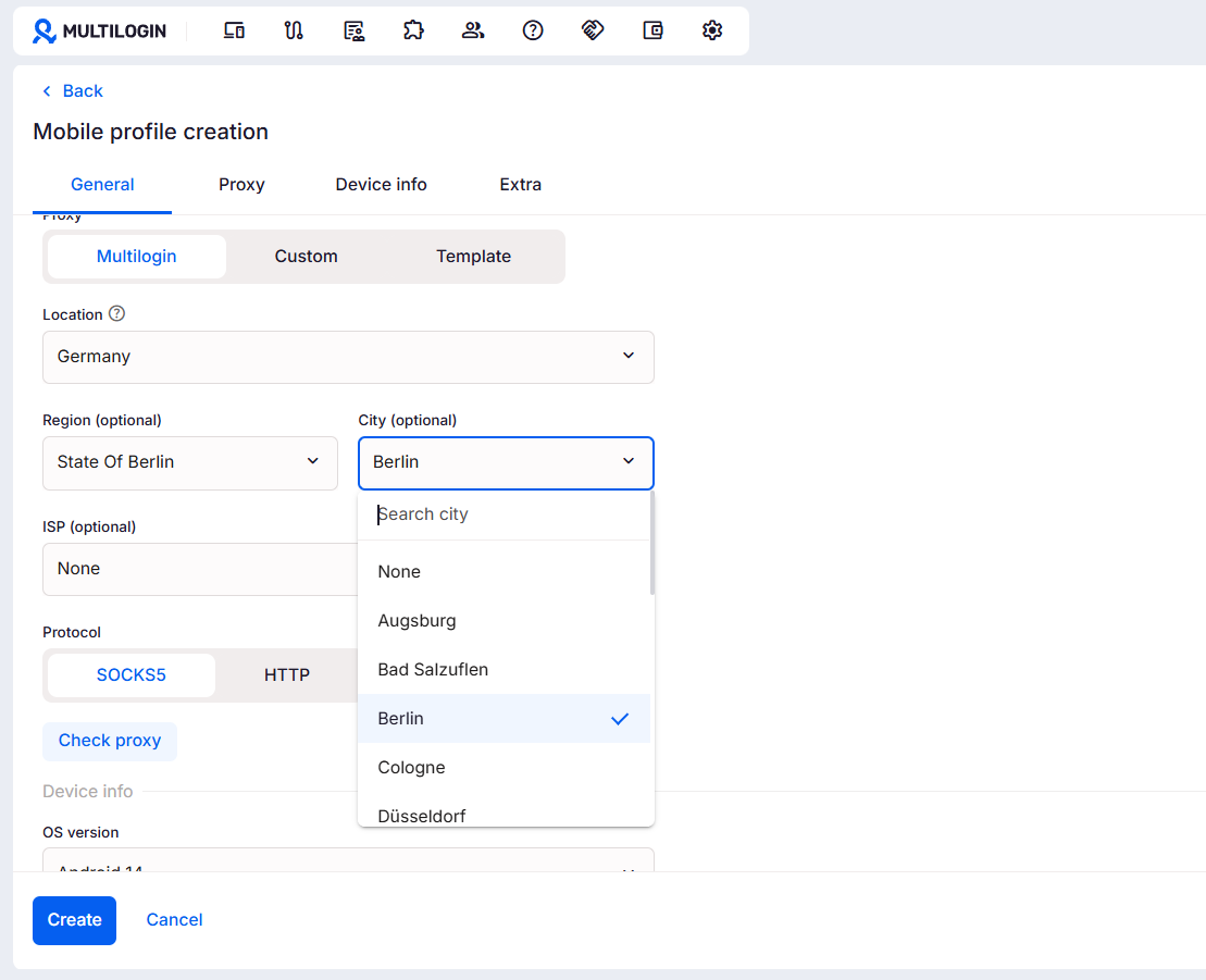 Navigate to the proxy settings and select Multilogin as your provider. This gives you access to built-in residential proxies across more than 150 locations, so your cloud phone connects from wherever you need it to.