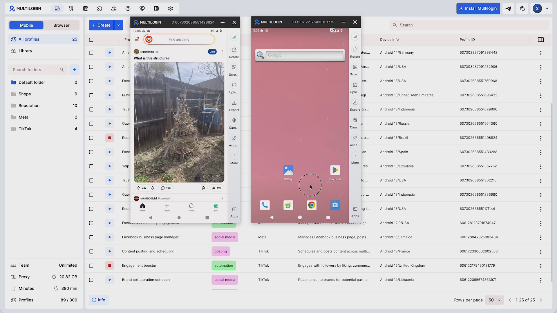 - Reddit, Quora, and Discord — community-driven platforms where users build presence, manage communities, and drive engagement. Each profile behaves like a genuine independent user, keeping accounts natural and healthy over time.