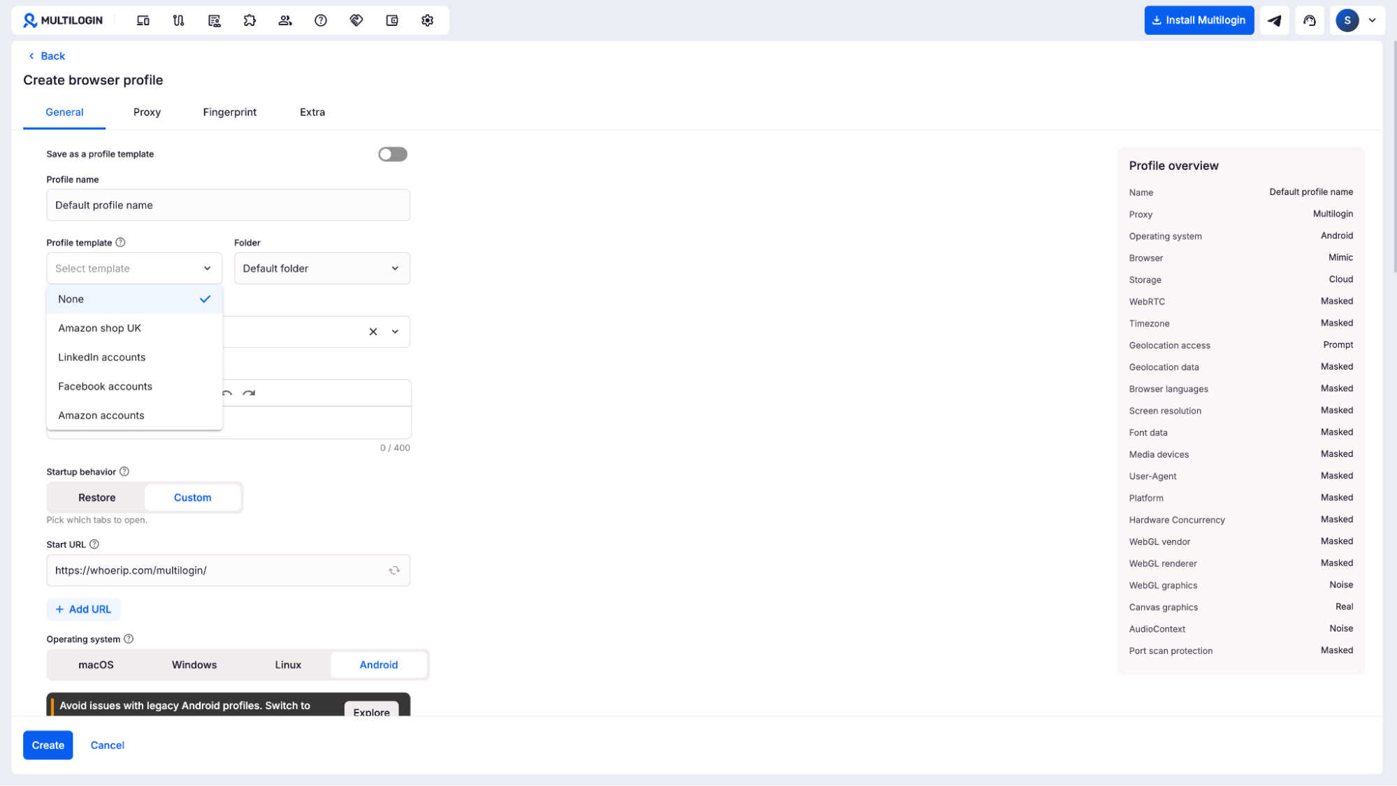 Hit Create to begin setting up a new browser profile.