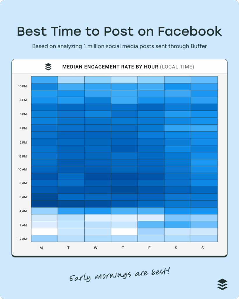 While weekdays generally see higher engagement, the best day and time to post on Facebook can vary. Here’s a general breakdown of what to expect throughout the week. Use this as a starting point, but always verify with your own Facebook Insights for the most accurate data.