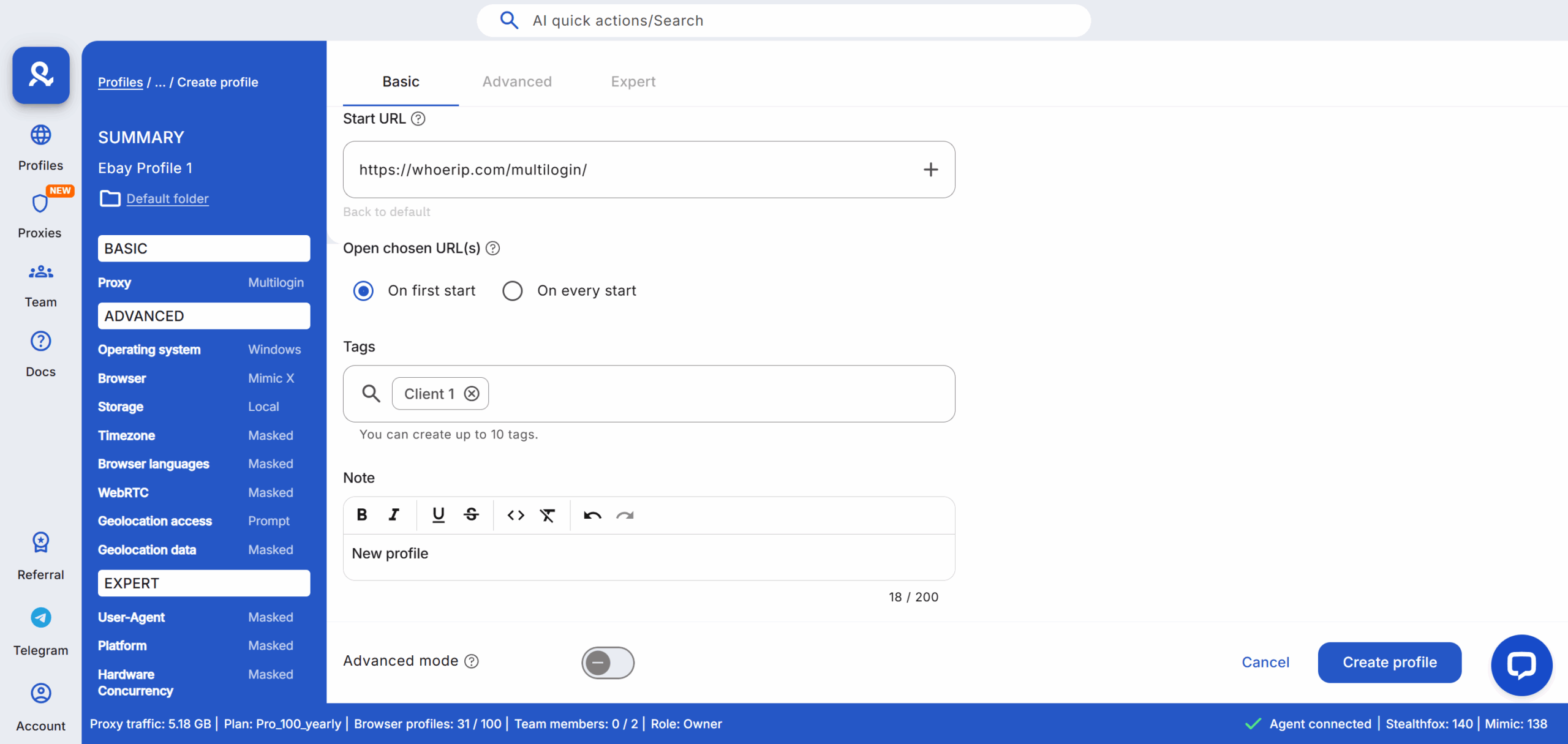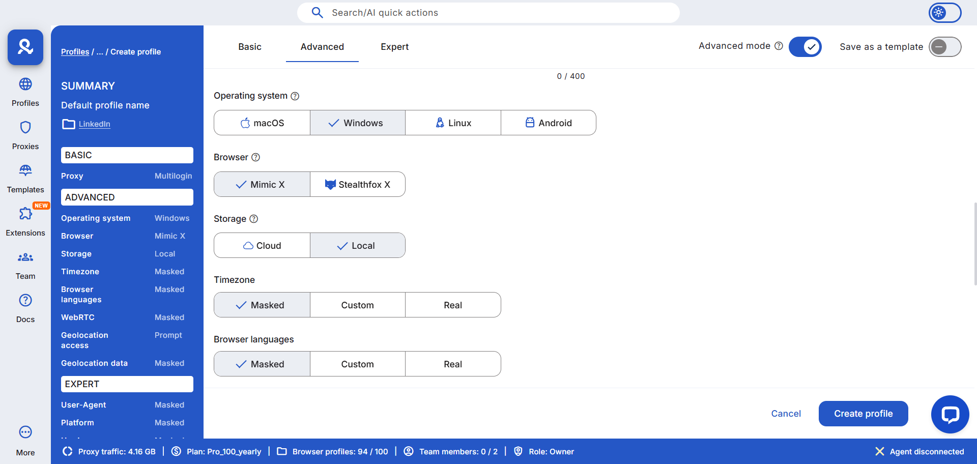 Give the profile a clear name (e.g., Sales_US_East_01). Pick a proxy location that matches the account’s claimed geography — country and city — to avoid location mismatches that trigger LinkedIn checks. Multilogin has built-in residential proxy options, which you can assign per profile.