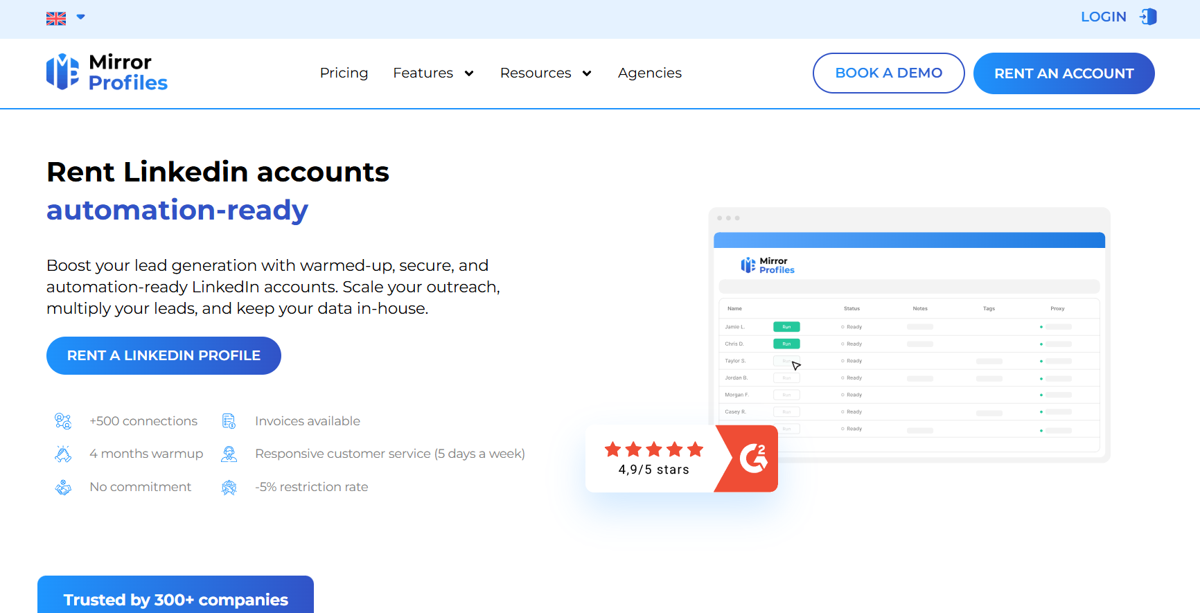 User reviews: Mostly positive. Customers commend the service for providing aged, verified LinkedIn profiles with full control over messaging and interactions, leading to safer and more effective outreach.