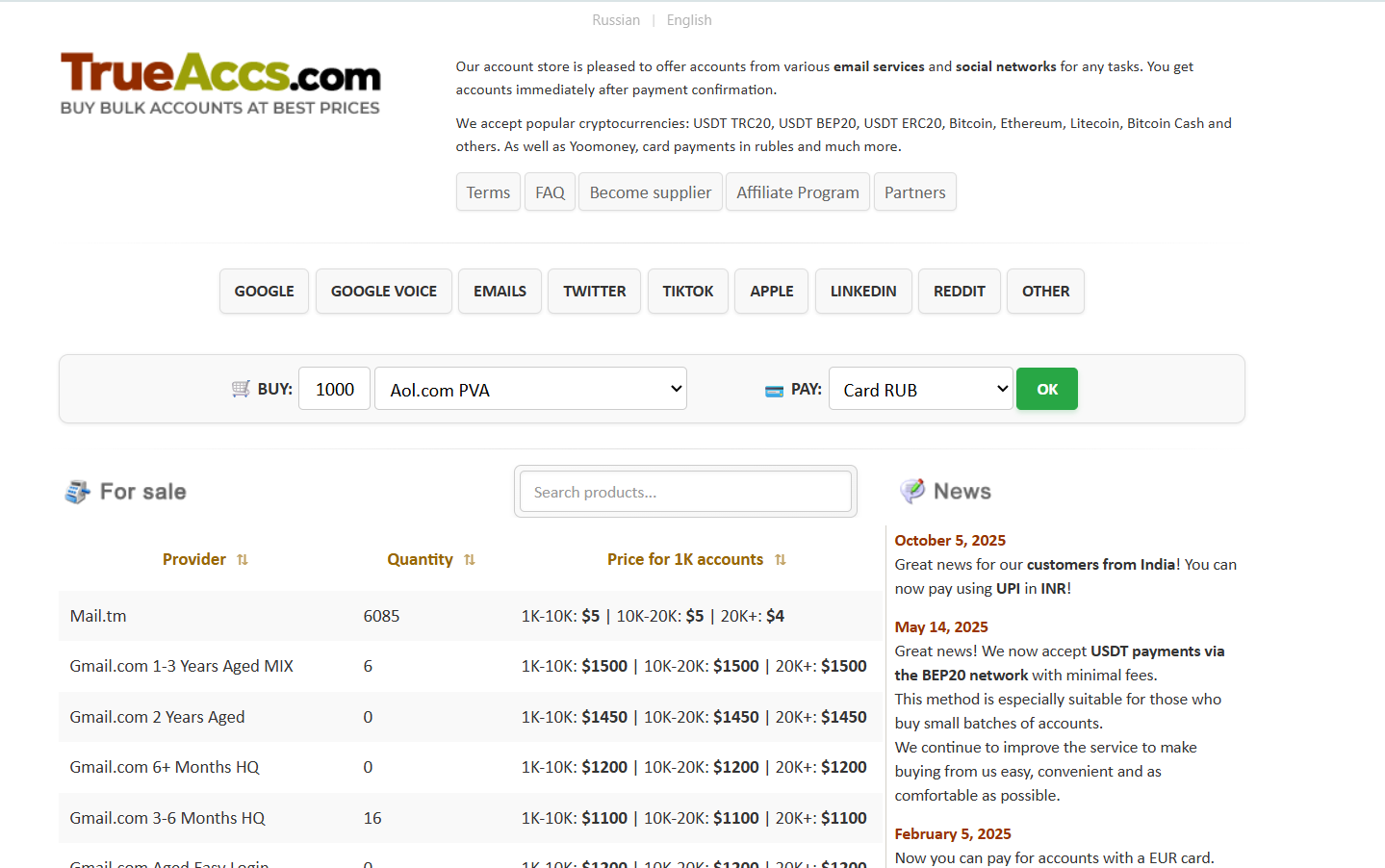 User reviews: Mixed. The platform is mentioned as a source for bulk accounts at a reasonable price, with the quality being an unknown factor that “corresponds to the price.”