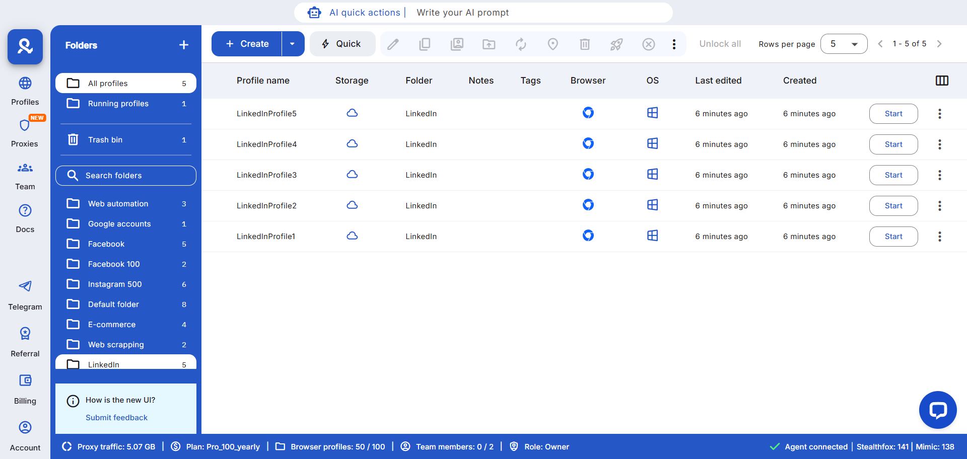 - Account isolation: Each LinkedIn profile runs in its own browser environment with a unique fingerprint and local storage, eliminating cross-detection risks.