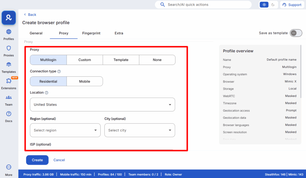 In the profile settings, add a residential proxy. This ensures your cloud phone has a clean, trusted IP address that’s not associated with data centers or VPNs. Multilogin offers built-in residential proxies with access to 30 million IPs across 195+ countries, or you can integrate your own proxy management provider.