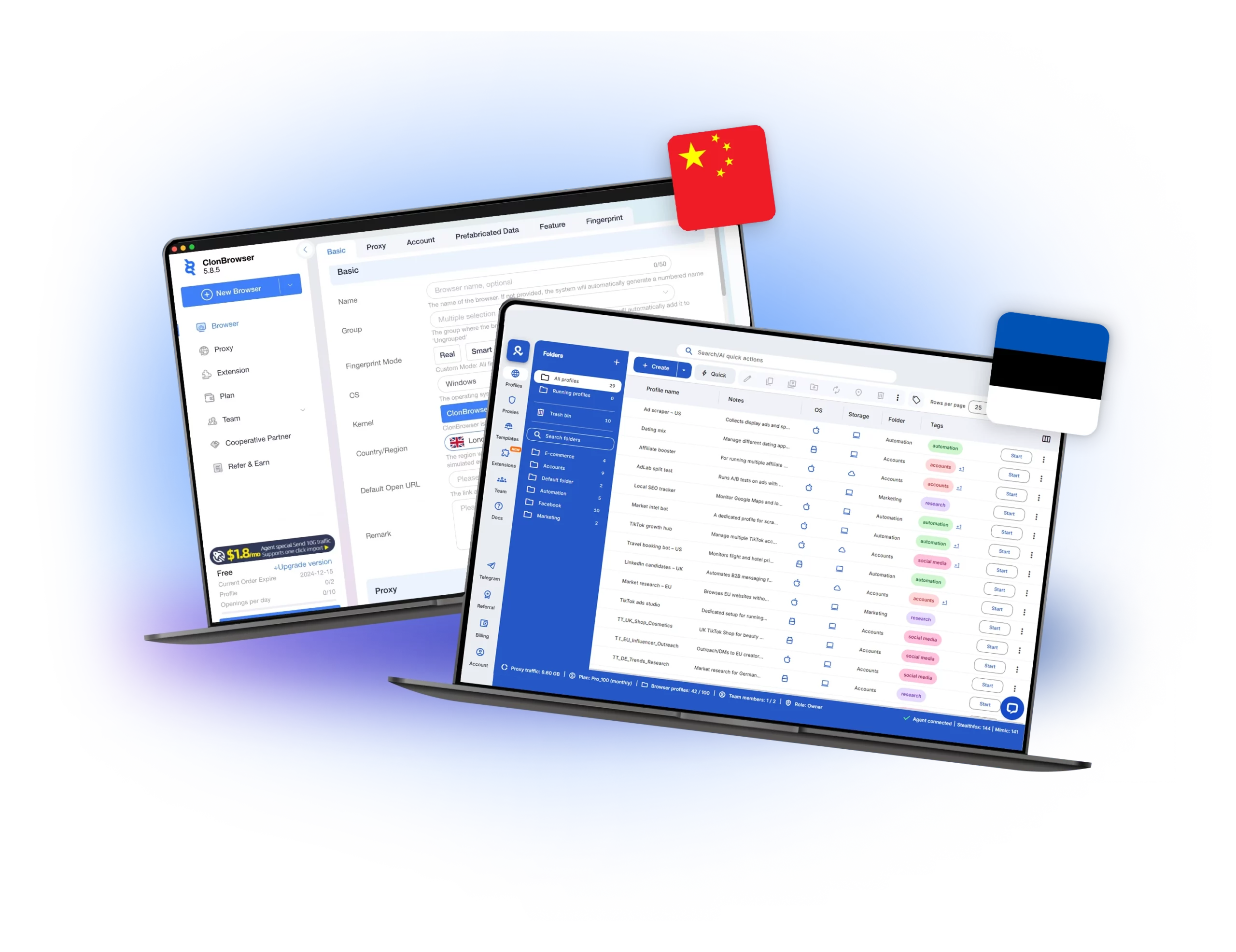 ClonBrowser masks basics like canvas, WebGL, and user-agent. Multilogin provides far more — 55+ parameters plus Mimic and Stealthfox browsers — ensuring each profile is unique and optimized for sensitive platforms like Facebook Ads or TikTok.