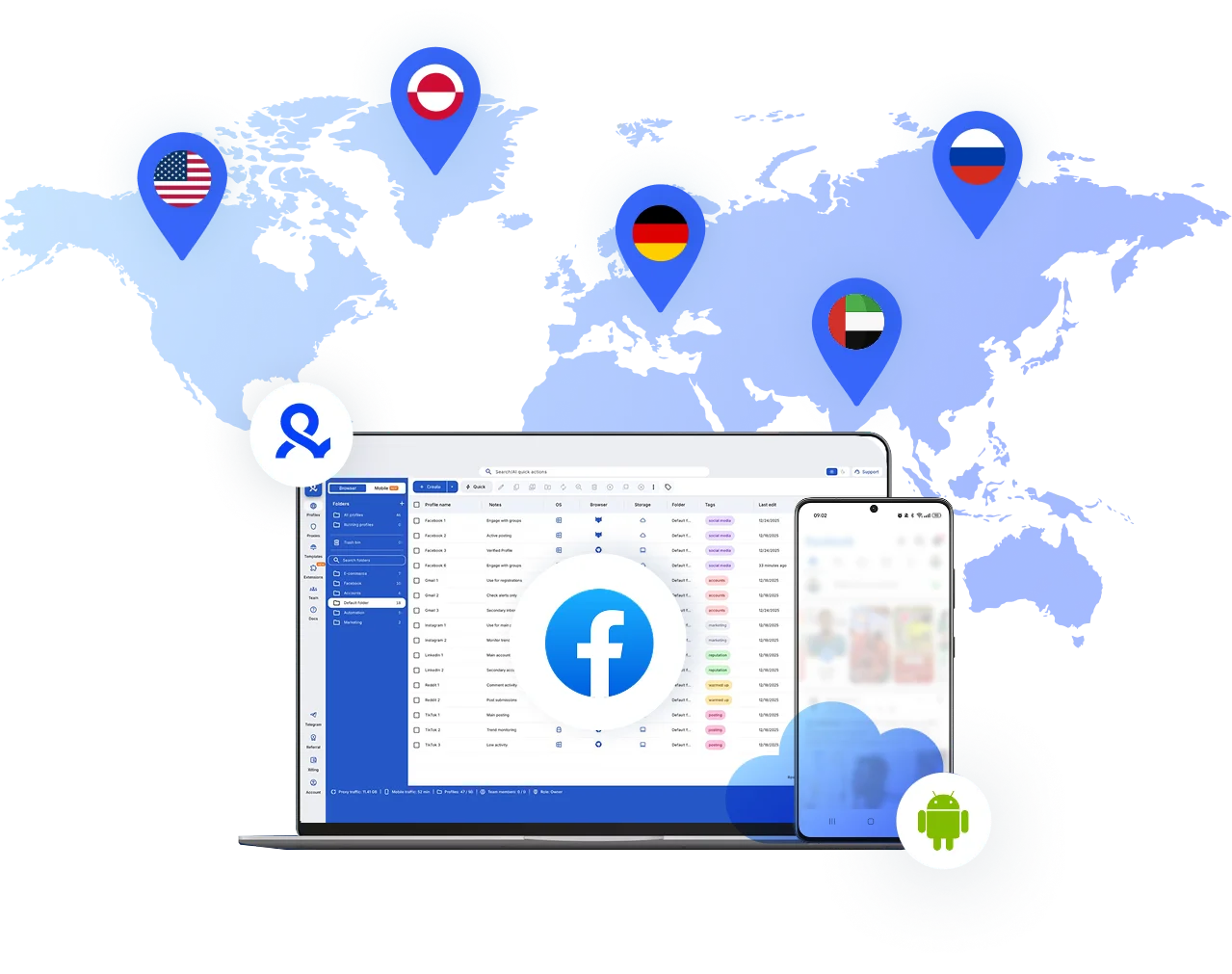 Cloud phones give each account its own persistent mobile environment. A Facebook proxy provides the right network context for each account’s location. Browser profiles keep web-based workflows separate and contained. Multilogin connects all of it so teams can focus on running campaigns instead of diagnosing access problems.