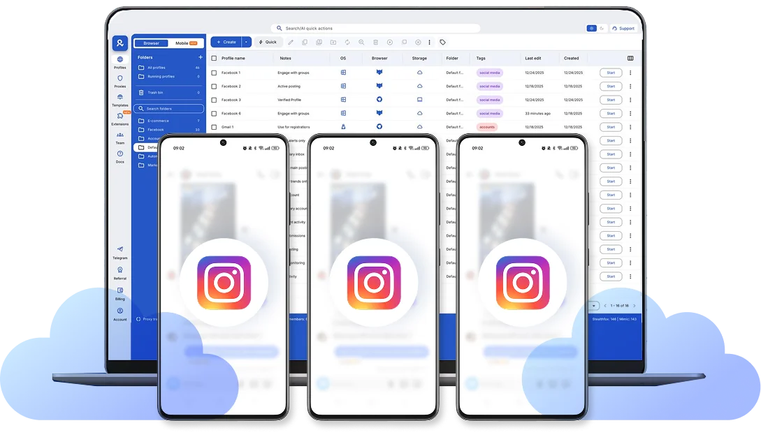 Yes. Cloud phones are commonly used to manage multiple Instagram accounts without sharing devices or overlapping sessions. Each account runs inside its own environment, which reduces the risk of session conflicts caused by switching profiles on one phone. Platforms like Multilogin allow you to launch multiple cloud phones side-by-side from one dashboard, making it easier to manage several accounts at the same time.