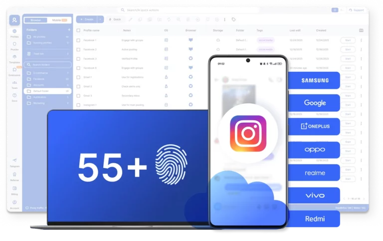 Manage multiple Instagram accounts with a beginner‑friendly 2-in-1 platform: real Android cloud phones with genuine IDs, mobile proxies with 30M+ IPs, antidetect technology with 55+ fingerprint parameters, and a stable desktop app to control everything from one dashboard.
