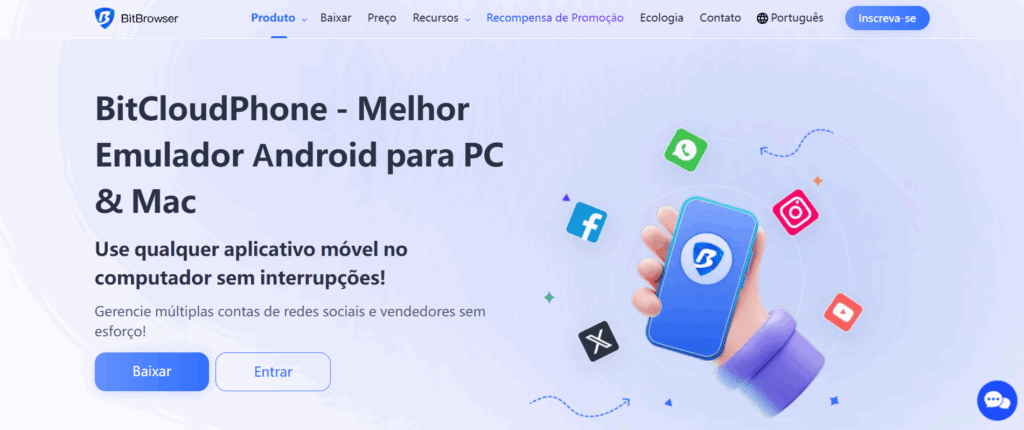 A página do BitCloudPhone do BitBrowser o apresenta como um ambiente Android para executar aplicativos móveis em computadores e gerenciar várias contas, com opções de pagamento baseadas em tempo.