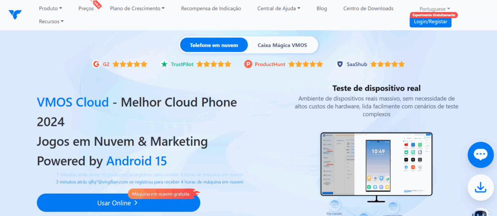 O VMOS Cloud se apresenta como uma plataforma de “telefone em nuvem Android”, promovendo explicitamente o marketing social com múltiplas contas e fluxos de trabalho com múltiplas instâncias, incluindo a possibilidade de “uma pessoa operar N telefones em nuvem”.